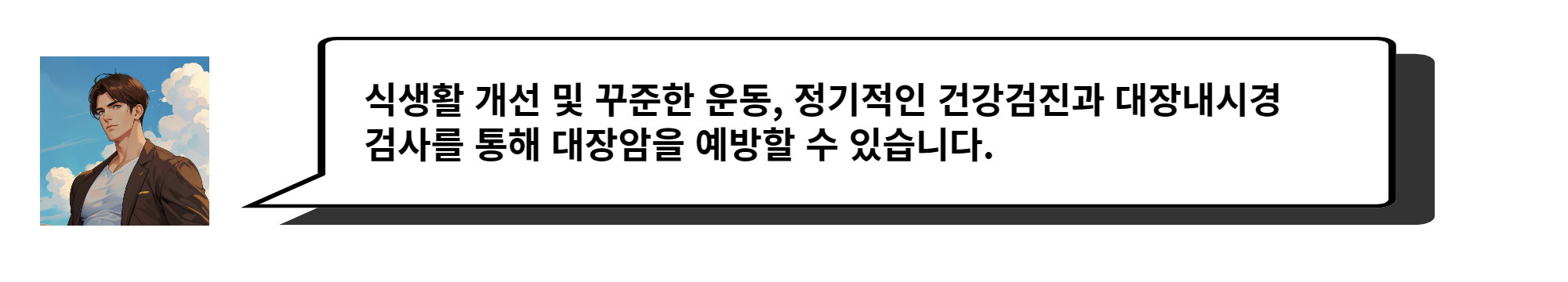 대장암은 조기에 발견하면 치료가 가능한 질병이지만, 증상이 나타나기 전에는 잘 모르는 경우가 많습니다. 그래서 정기적인 건강검진과 대장내시경 검사를 받는 것이 중요합니다. 하지만 검사만으로는 부족합니다. 대장암은 우리의 식습관, 생활습관과 관련이 깊기에 대장암을 예방하기 위해서는 우리의 식습관, 생활습관을 개선하는 것도 반드시 필요합니다. 대장암을 예방할 수 있는 방법들을 아래에 소개합니다.
