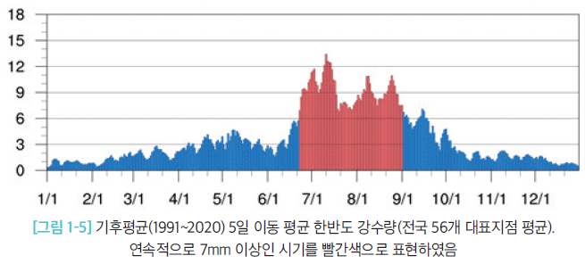 우리 나라는 연간 강수량(1333mm)의 50% 정도(약 655mm)가 이 장마를 포함한 여름철에 집중이 되어 있습니다.